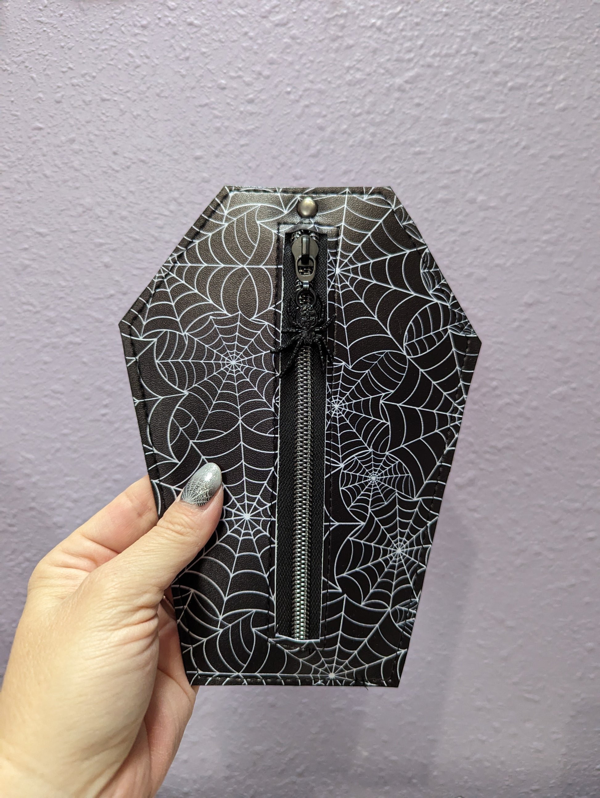 The Il Grasso coffin wallet is hand crafted with faux leather, has 6 card sleeves and a zipper portion for extras that features a custom specialty zipper pull.