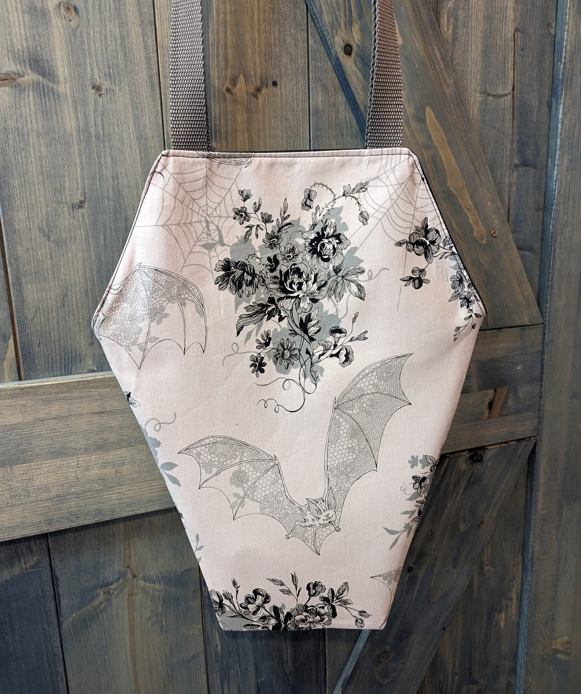 This tote is made with a cotton exterior fabric, sturdy waterproof canvas lining, and nylon straps. Coffin shaped and perfectly sized for all of your haunted adventures!