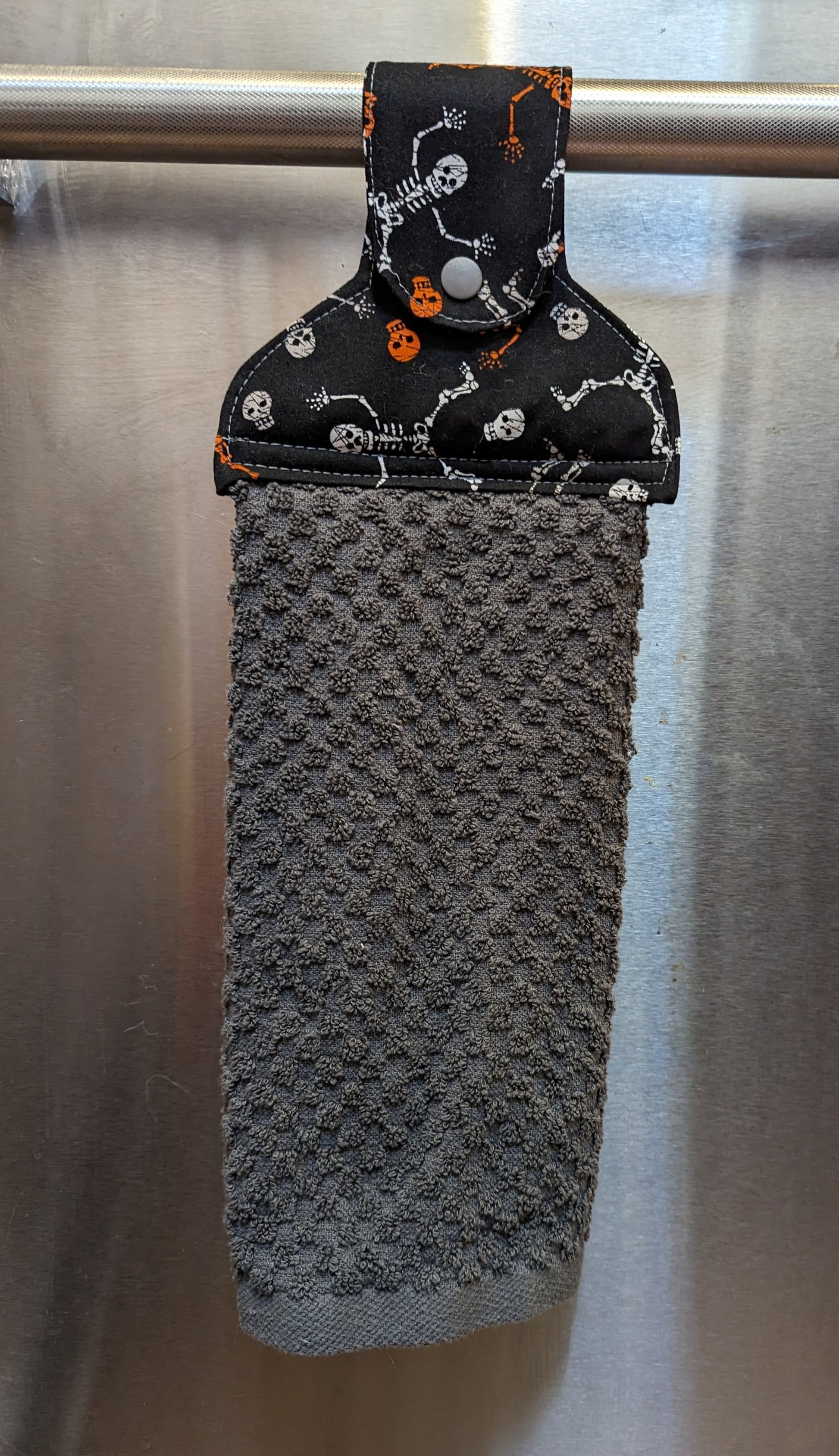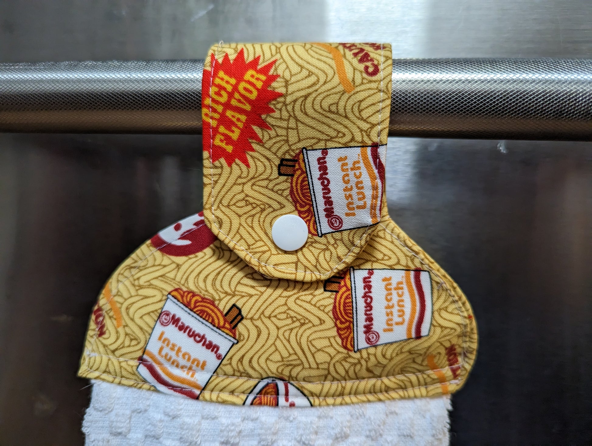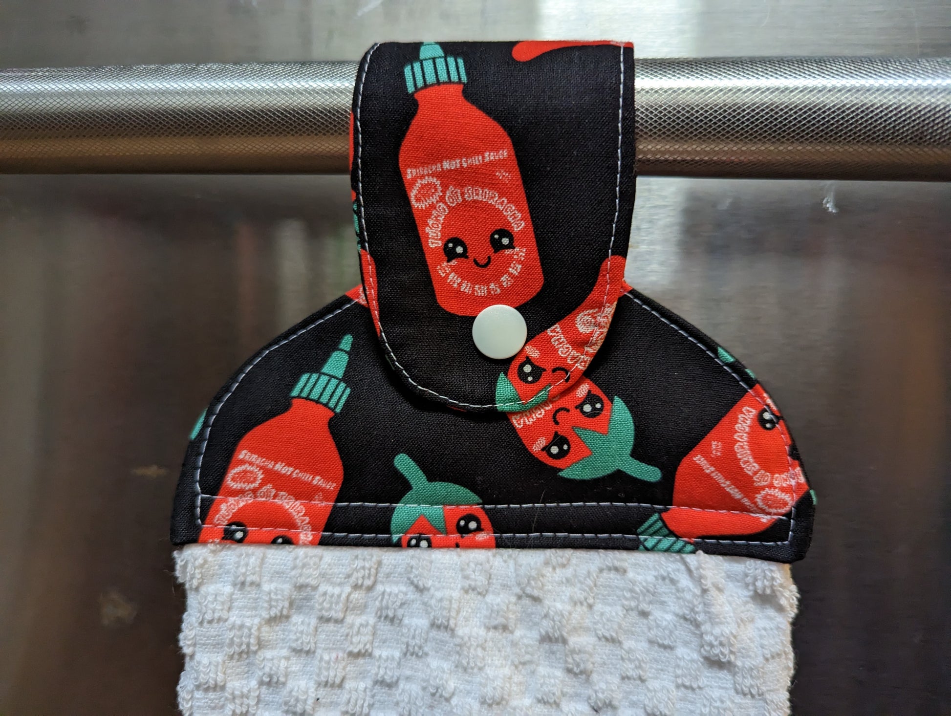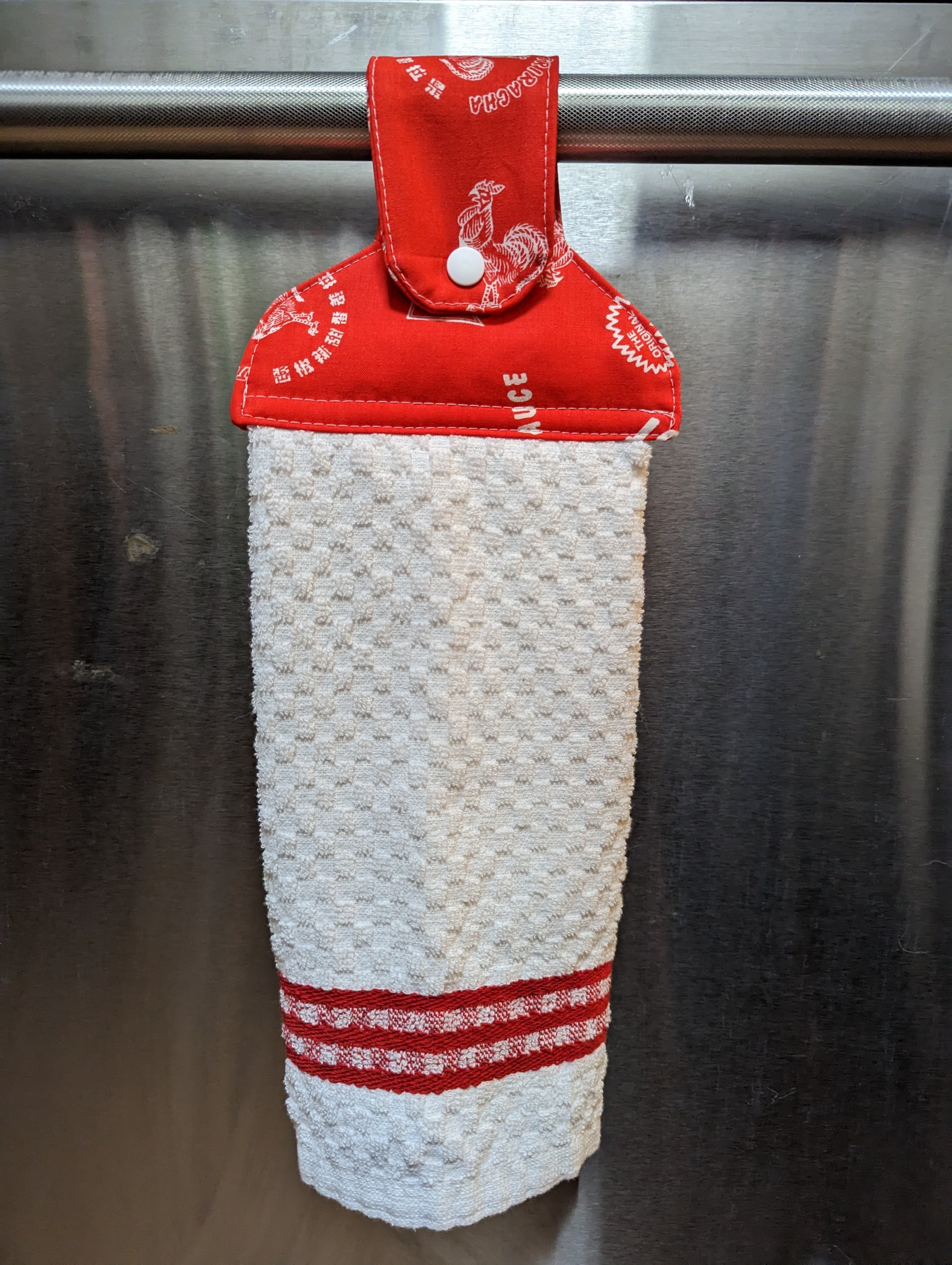This kitchen towel stays off the floor and right where you need it to dry your hands. Plastic snap closure attaches around most standard kitchen appliance bars.